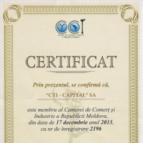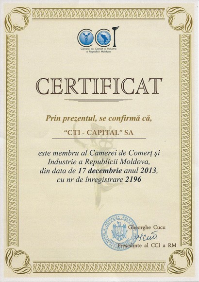The company "CTI-Capital" JSC has become a member of the Chamber of Commerce and Industry of the Republic of Moldova.